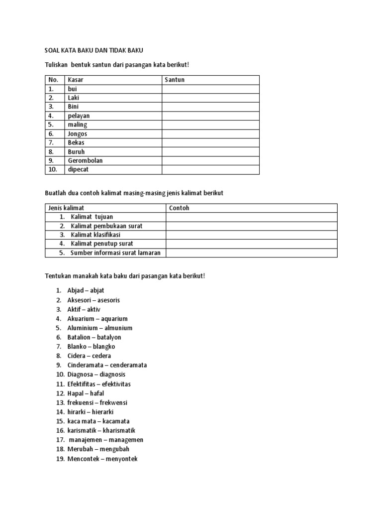 Aktip, pasip, efektip, karna, poto, bis, obyek, tekhnik, nasehat, biosfir, dan lain sebagainya. Bentuk kata tetap dan tidak mudah berubah. Contoh kata baku dan tidak baku. Kata tidak baku merupakan kata yang dipakai tidak sesuai dengan pedoman atau kaidah bahasa yang sudah ditentukan. Berikut ini adalah 300+ contoh kata baku dan tidak baku yang paling sering salah dan digunakan, disertai dengan pengertian dan fungsinya.